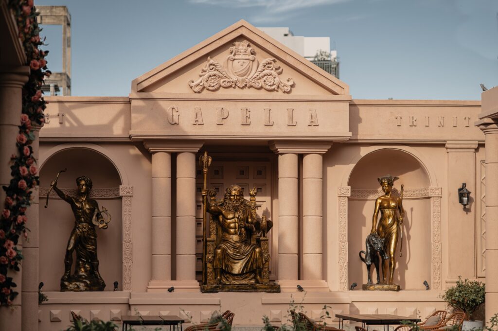 Ấn tượng đầu tiên khi bước chân vào Gapella Dining & Cocktail Bar chính là hệ cột trụ được bố trí bao quanh không gian, gợi nhớ đến những ngôi đền cổ kính của Hy Lạp. Các cột trụ này không chỉ mang lại sự bề thế mà còn tạo nên cảm giác trang nghiêm, cổ điển – một nét đặc trưng không thể thiếu của kiến trúc Hy Lạp.