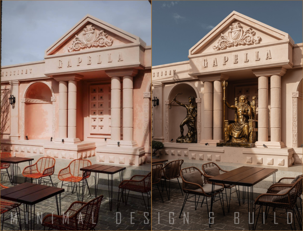 Gapella Dining & Cocktail Bar không chỉ là một quán cà phê; đó là một tác phẩm nghệ thuật được lấy cảm hứng từ kiến trúc Hy Lạp cổ đại – một nền kiến trúc nổi tiếng với sự vĩ đại, cân xứng và vẻ đẹp vượt thời gian. Đây là nơi mà các Kiến trúc sư Minimal Design & Build đã thổi hồn vào từng chi tiết, tạo nên một không gian không để uống cà phê mà để tận hưởng cafe trong sự đẳng cấp và độc đáo.